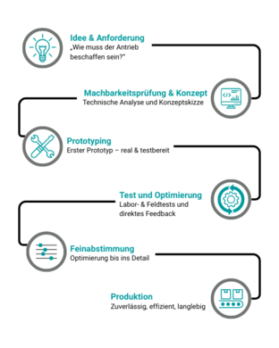 Der Weg von der Idee zur Serienproduktion ist klar strukturiert: Gemeinsam mit dem Kunden definieren wir die Anforderungen, prüfen die Machbarkeit und entwerfen das passende Konzept. Ein Prototyp entsteht, durchläuft Tests im Labor und im Feld – präzise, praxisnah, effizient. Erkenntnisse fließen direkt in die Feinabstimmung ein, bevor die Serienfertigung beginnt. Jede Phase sichert Präzision, Effizienz und Langlebigkeit.